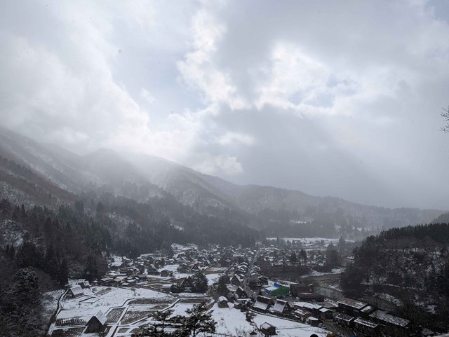 おなじみの白川郷の展望台へ。雪が舞っていました。